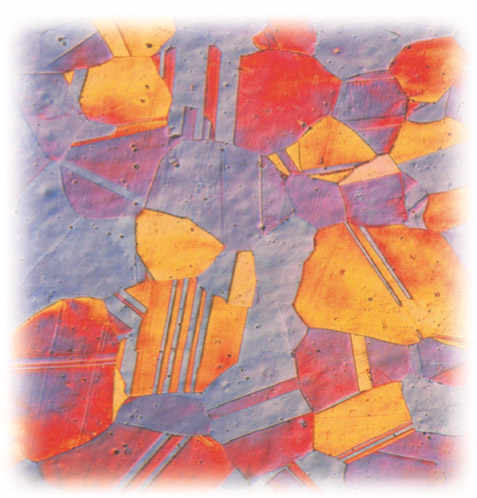 通过大量的观察和研究,人们发现,晶体可分为单晶体和多晶体两类。单晶体具有规则的几何形状,外形都是由若干个平面围成的多面体。例如,食盐晶体是立方体,纷飞的雪花(图 2-3)虽然形状各异,但都呈六角形。多晶体没有规则的几何形状,通过显微镜观察其表面会发现,它们都是由大量细微的单晶体杂乱无章地排列在一起构成的(图 2-4)。