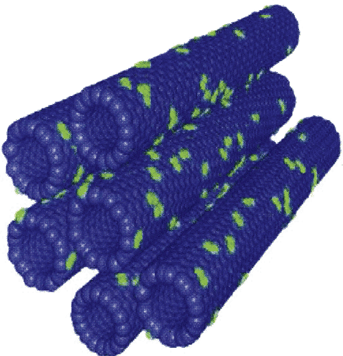 纳米是长度单位,1 nm = 10−9 m。粒度在 1~100 nm 的材料称为纳米材料。人们发现,当材料小到纳米尺度时,其力、热、声、光、磁等方面的某些性能会突变。碳纳米管(图 2-34)是目前纳米材料研究领域的热点之一。碳纳米管是由碳原子层卷曲而成的碳管,管直径一般为几纳米到几十纳米,管壁厚度仅为几纳米,五万根碳纳米管集中起来也只有人的一根头发丝粗。它的成分和石墨一样,但韧性很高,导电性极强,兼具金属和半导体的特性。