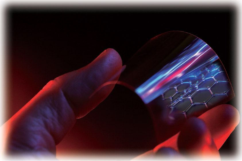 石墨烯具有优异的光学、电学、力学特性,是已知强度最高的材料之一,并且能弯曲,有很好的韧性。石墨烯可制作传感器,其灵敏度可与单分子检测的极限相比拟;还可用来制作晶体管,这种晶体管在接近单个原子的尺度上依然能稳定地工作。作为柔性显示屏(图 2-36)的基础材料,石墨烯的发展前景备受瞩目。石墨烯的研究与应用在化学、材料、物理、生物、环境、能源等众多学科领域已取得了一系列重要进展。