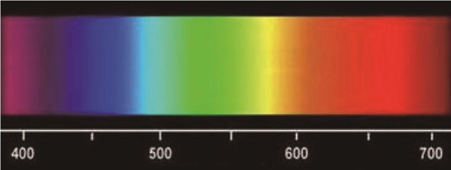 当复色光经过棱镜或光栅后,被色散开的单色光按波长(或频率)大小依次排列的图案,称为光谱。太阳光通过三棱镜折射后,会形成由红、橙、黄、绿、蓝、靛、紫顺次连续分布的彩色光谱,覆盖了 400 ~ 760 nm 的可见光区,如图 4-10 所示。像这种包含有各种色光且连续分布的光谱称为连续光谱。