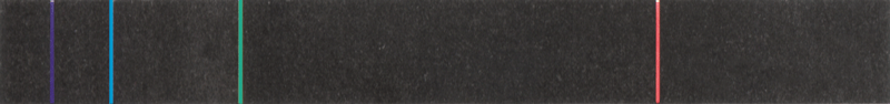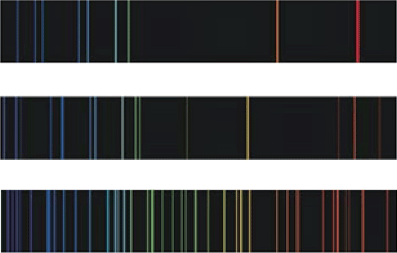有些光谱不是连续的,而是由一条条的亮线组成,这种光谱称为线状光谱(图 4-11)。原子的发射光谱都是线状光谱,这些亮线称为原子的特征谱线。每种原子都有独自的特征谱线,人们利用特征谱线来鉴别物质或确定物质的化学组成,这种方法称为光谱分析。光谱分析在科学研究中有着广泛的应用,如人们曾通过光谱分析发现了若干新元素,像铯、铷、铊、铟、镓等;通过光谱分析检查半导体材料的纯度等。