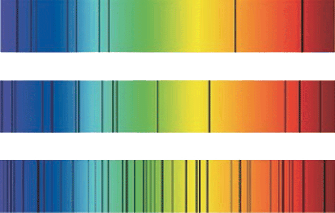 光谱可分为发射光谱和吸收光谱。物体自身发光形成的光谱称为发射光谱,发射光谱又分为连续光谱和线状光谱。高温物体发出的包含连续分布的各种波长的光通过其他物质时,某些波长的光被该种物质吸收后,在连续光谱中相应波长的位置上便出现了暗线,这样的光谱称为吸收光谱(图 4-12)。