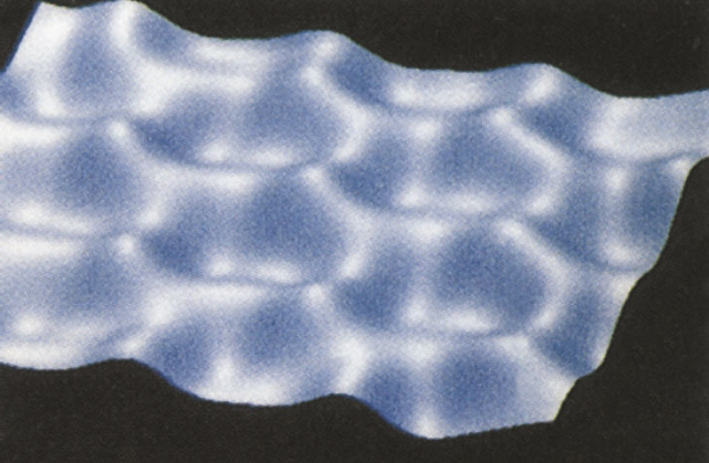 扫描隧道显微镜(STM)以一根非常细小的针尖和被研究物质的表面为两个导体,形成两个电极(图 6-17)。当针尖与样品表面非常接近(一般小于 1 nm)时,由于电子存在波动性,电子就会穿过两个电极之间的绝缘层流向另一极,这种电流称为隧道电流。隧道电流的大小与针尖到样品表面的距离密切相关。测量时让针尖在样品表面扫描,控制隧道电流不变,针尖随样品表面高低起伏。针尖的三维运动信号可通过计算机系统在屏幕上直接显示,或者在记录纸上打印下来,获得样品表面的三维立体信息(图 6-18)。在低温下,利用 STM 可对原子进行直接操纵和排布;在常温下,也可对单个原子进行拾取和填充,实现了按人类意愿重新排布单个原子的梦想。