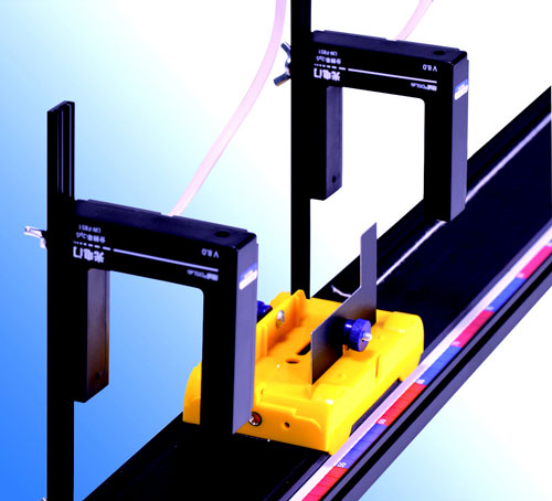 利用光电门传感器测量加速度的实验装置如图 4 – 2 所示。将两个光电门传感器相距一定距离固定在轨道中部附近,并通过数据采集器与计算机连接。