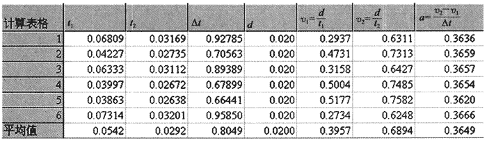 开始记录,同时释放小车,使其沿轨道较高端自由下滑。挡光片依次通过两光电门时,计算机会自动记录小车通过两个光电门时的挡光时间 t1、t2,并计算得到 v1、v2 和 a。