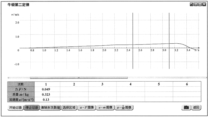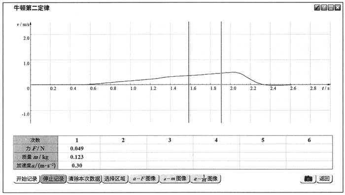 释放小车,使其在拉力 F 作用下运动,在计算机显示的 v – t 图像中选择合适的区域得到加速度的大小,如图 4 – 6 所示。