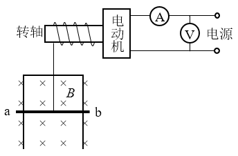 如图所示,电动机通过其转轴上的绝缘细绳竖直向上牵引一根原来静止的长为 L = 1 m、质量 m = 0.1 kg导体棒 ab,导体棒紧贴在竖直放置、电阻不计的金属框架上,导体棒的电阻 R = 1 Ω,磁感强度 B = 1 T 的匀强磁场方向垂直于导体框架所在平面,当导体棒在电动机牵引下上升 h = 3.8 m 时,获得稳定速度,此过程导体棒产生热量 Q = 2 J。电动机工作时,输出功率 P = 6 W 恒定,不计一切摩擦,求:
