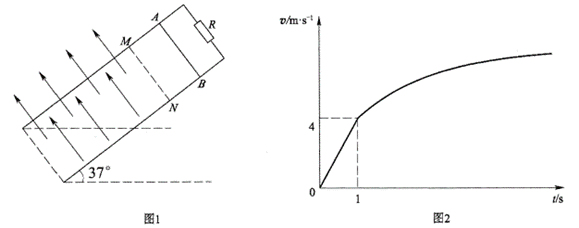 如图 1 所示,两条足够长的平行金属导轨间距为 0.5 m,固定在倾角为 37° 的斜面上。导轨顶端连接一个阻值为 1 Ω 的电阻。在 MN 下方存在方向垂直于斜面向上、大小为 1 T 的匀强磁场。质量为 0.5 kg 的金属棒从 AB 处由静止开始沿导轨下滑,其运动过程中的 v – t 图象如图 2 所示。金属棒运动过程中与导轨保持垂直且接触良好,不计金属棒和导轨的电阻,取 g = 10 m/s2,sin37° = 0.6,cos37° = 0.8。