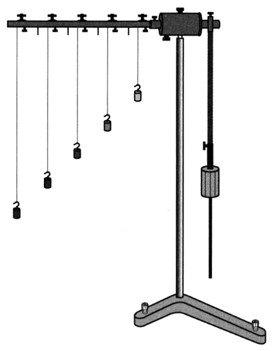 开始时,整个装置处于静止状态。垂直于装置平面,将 A 摆拉离平衡位置后由静止释放,A 摆开始振动。A 摆的振动通过横梁使 B 摆、C 摆、D 摆也振动起来。观察这些摆的振幅大小和振动的频率。