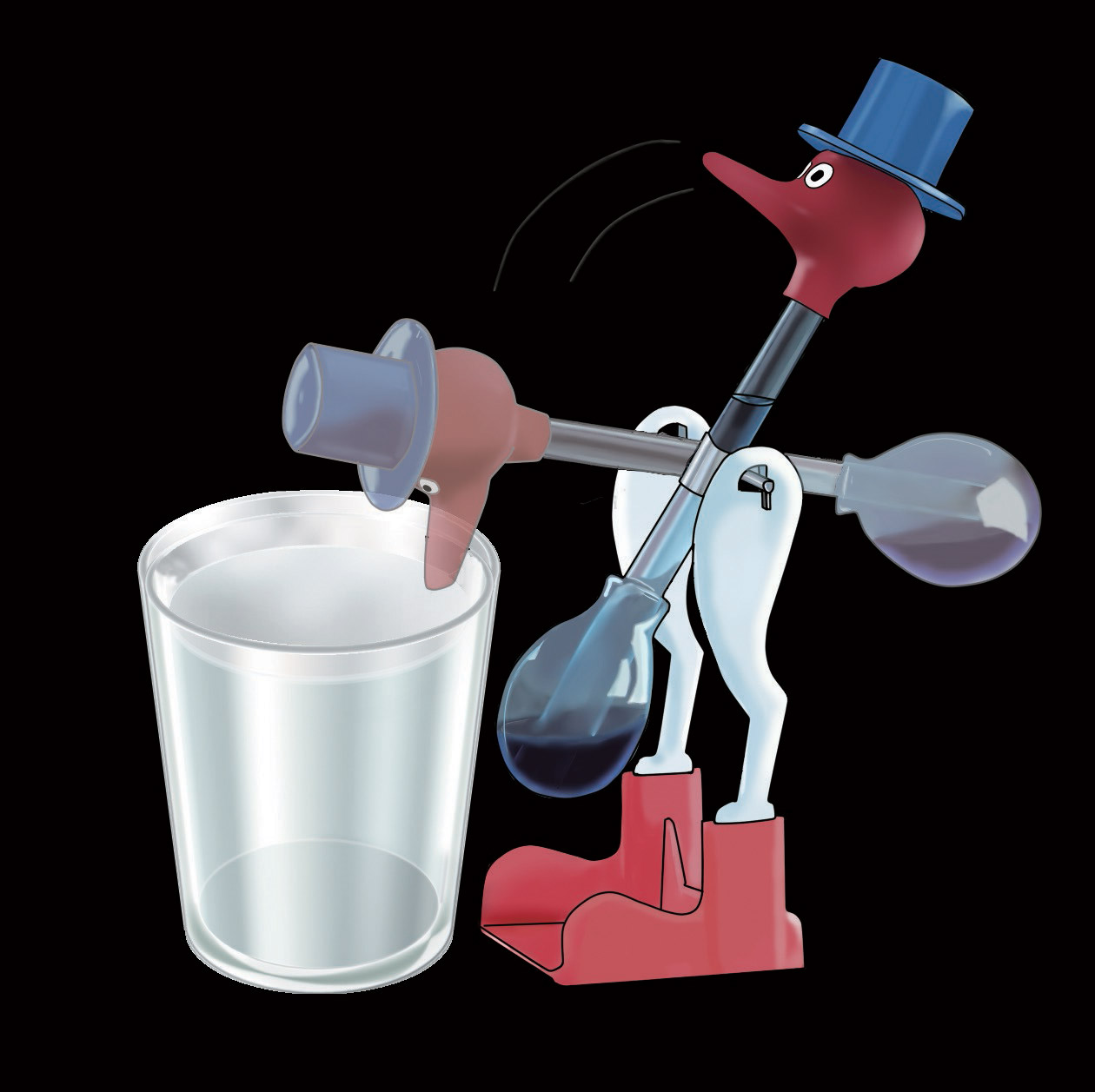 图 12 – 3 所示为“饮水鸟”玩具。两玻璃球由细玻璃管相连,盛有一定量的高挥发性化学试剂的下球作为鸟身;上球连同尖嘴被吸水布包起来作为鸟头。整个装置架在支架上,可绕支点转动。在鸟的前方放一杯水,保证它俯下身子时尖嘴能接触水面“喝”到水。轻按鸟头,让它“喝”一口水,饮水鸟就会直立、抬头,并不断地自动点头喝水。