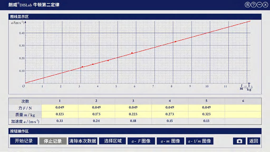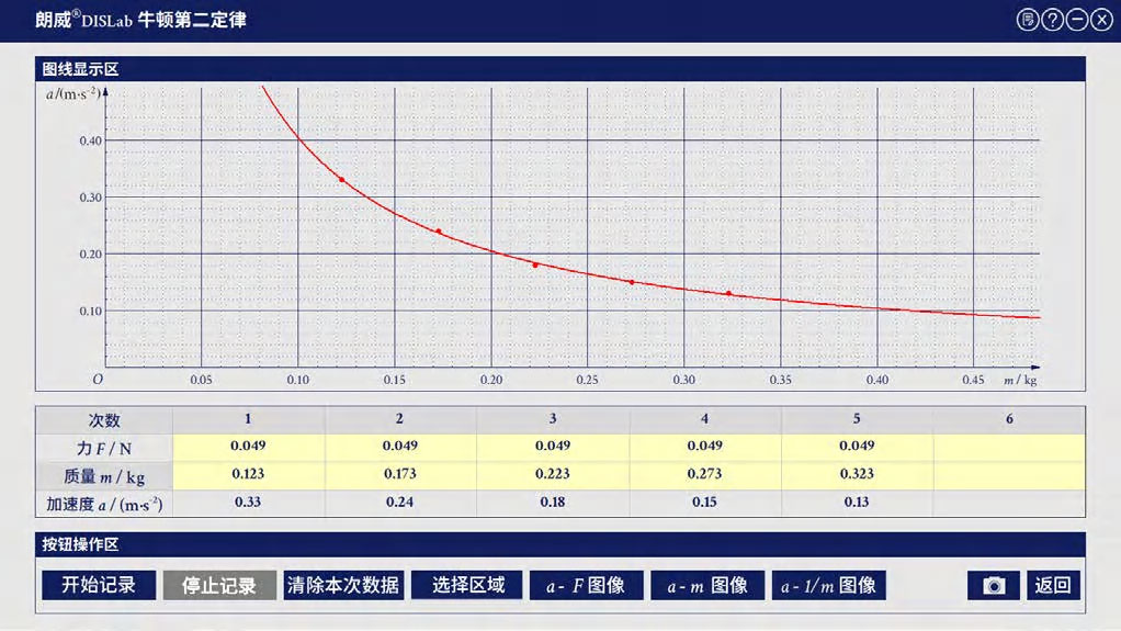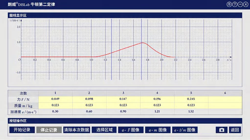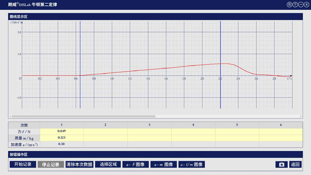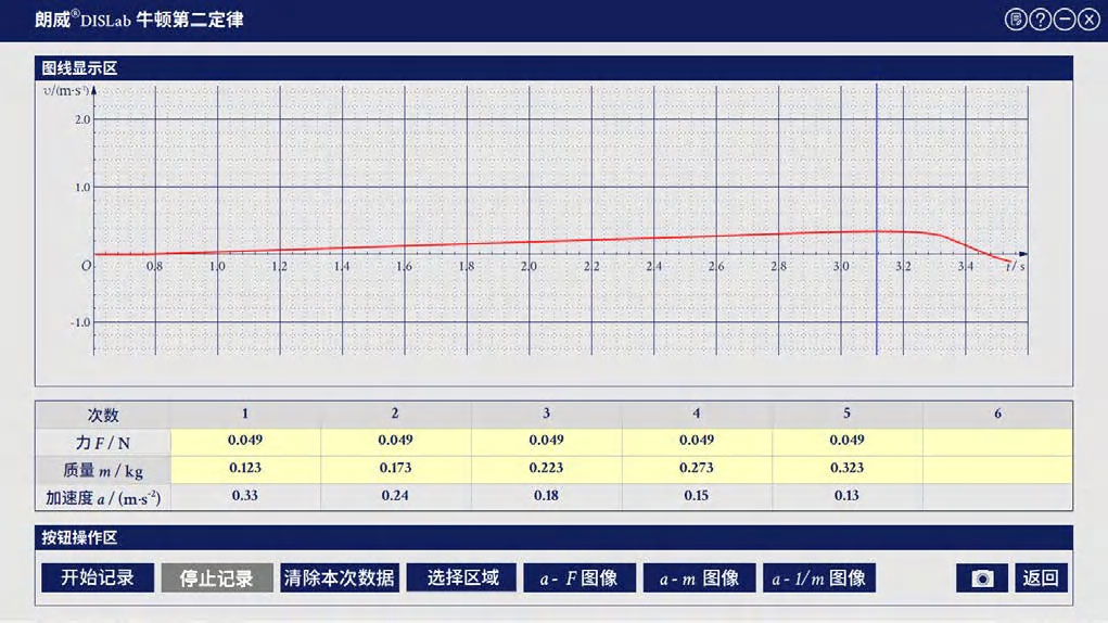 2 选取专用软件中“牛顿第二定律”实验条目,输入小车质量、拉力等参数值。(本次实验:m = 0.123 kg,F = 0.049 N);