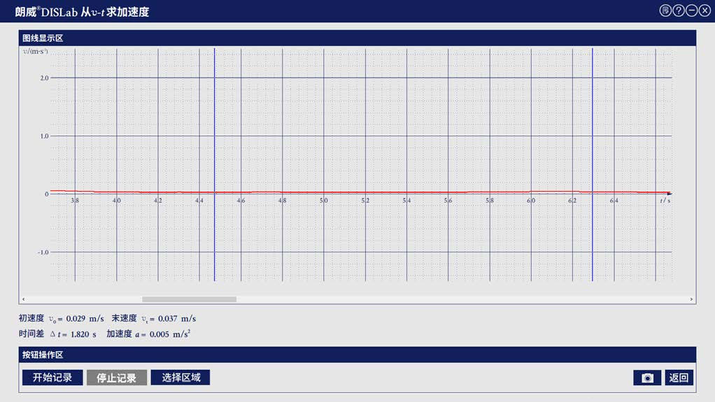 4 小车停止运动后单击“停止记录”,单击“选择区域”,选择研究区间,系统自动获取对应的加速度(图 1 – 5);