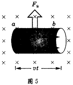如图5,设有一段长为L、横截面积为S的直导线,单位体积内的自由电荷数为n,每个自由电荷的电荷量为1,自由电荷定向移动的速率为v。这段通电导线垂直于磁场方向放入磁感应强度为B的匀强磁场中,求:(1)电流强度I。(2)通电导线所受的安培力。(3)这段导线内的自由电荷数。(4)每个电荷所受的洛伦兹力。(让学生推导:选择具有代表性的学生,把他的推导过程用实物投影仪展示到大屏幕上,再请这位学生简述推导过程。)