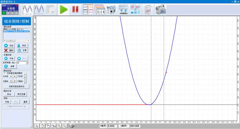 2 打开通用软件,添加“位移 – 时间”组合图线,开启位移传感器发射器电源,使其自由下落,得“s – t”图线(图 5 – 2);