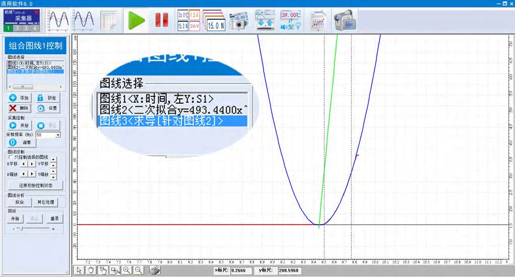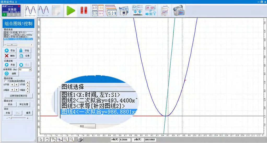 3 参照实验四的方法,通过图线分析(图 5 – 3 ~ 5 – 5),得到导数图线的拟合方程为 y = (986.8801x)+(− 8848.2236),获得当地的重力加速度值为 9.86(m/s2)。