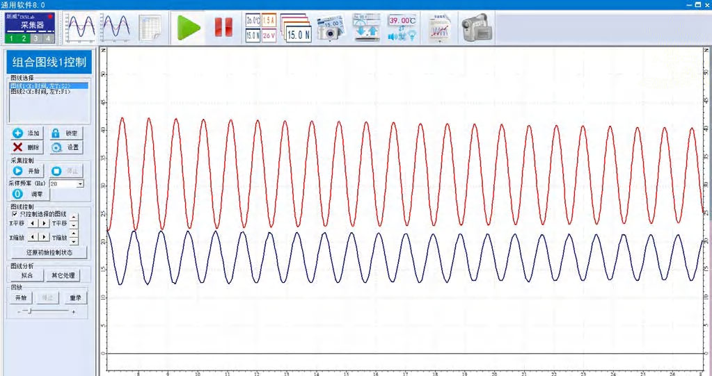 1 打开通用软件,单击“组合图线”,分别添加“s – t”和“F – t”图线,单击“开始”,使两条图线同步;