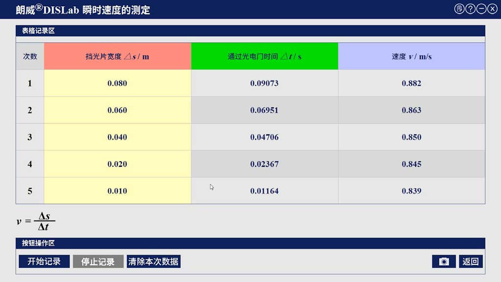 2 单击“开始记录”,分别将宽度 Δs 为 8 cm、6 cm、4 cm、2 cm、1 cm 挡光片固定到小车上,让小车从轨道同一位置自由下滑,软件记录挡光的时间,并计算出小车通过光电门时的平均速度,如图 10 – 2 所示;