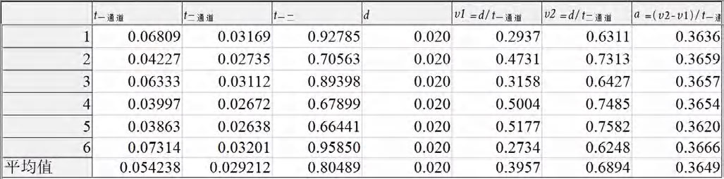 2 在计算表格中,添加变量“d”表示挡光片的宽度,输入数值 0.02 m,添加代表“初速度 v1”、“末速度 v2”、“加速度 a”的自由表达式“v1 = d/t一通道”、“v2 = d/t二通道”、“a = (v2 − v1)/t一二”,计算实验结果。计算出多次实验的平均值(图 13-1)。