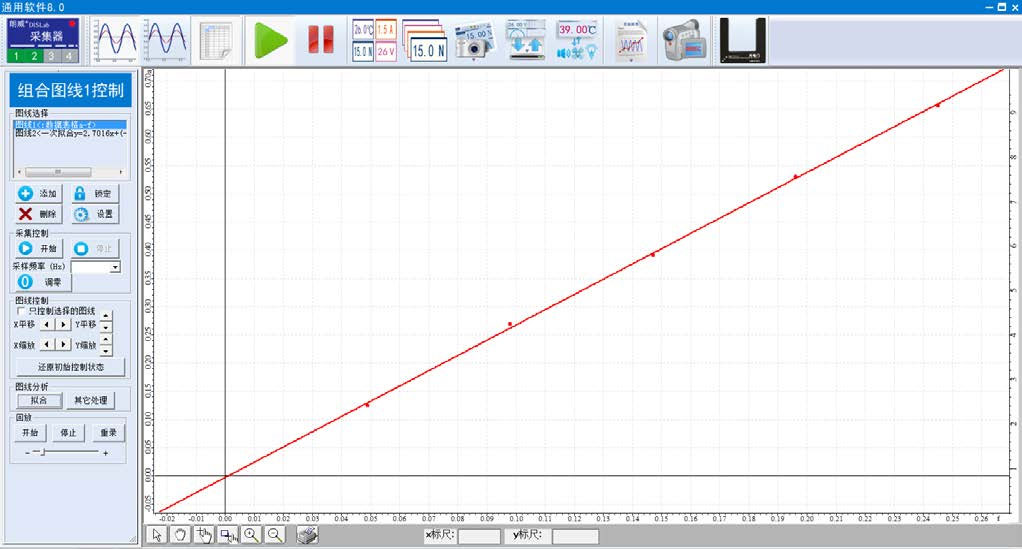 3 单击“绘图”,选择 x 轴为 “F”,y 轴为“a”,所得数据呈线性分布。单击“线性拟合”,得接近原点的直线(图 14 – 3)由此可得: 质量不变,加速度与拉力成正比。