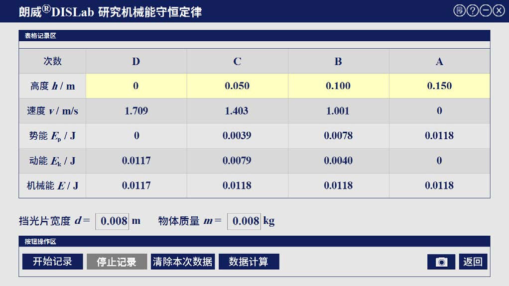 6 单击“数据计算”,得到摆锤在 A、 B、C、D 时的动能、势能和机械能值(图 19 – 2)。