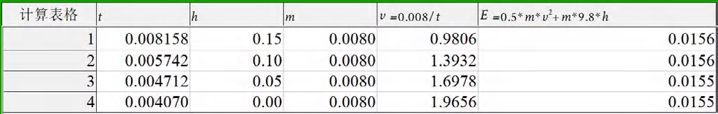 6 单击“公式”E = 0.5mv2 + 9.8mh,确定计算摆球速度和各点的机械能公式,得到实验结果(图 19 – 3 );
