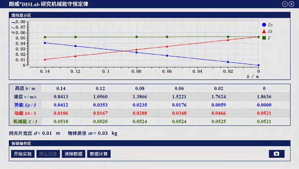 4 系统会自动记录摆锤通过各挡光片的速度,单击“数据计算”,系统计算出摆锤通过每个点时的动能和势能。三条直线图线分别为不同高度动能、势能与机械能的变化趋势(图 19 – 5)。