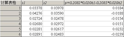 4 输入计算碰前与碰后的总动量公式:p = 0.2082*0.020/t1 - 0.2085*0.020/t2,得出实验结果(图 20 – 2);