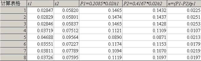 7 输入碰撞前后总动量计算公式 p1 = 0.2085*0.02/t1、p2 = 0.4167*0.02/t2,输入计算二者相对误差计算公式 n =(p1 - p2)/p1,计算得出实验结果(图20 – 3);
