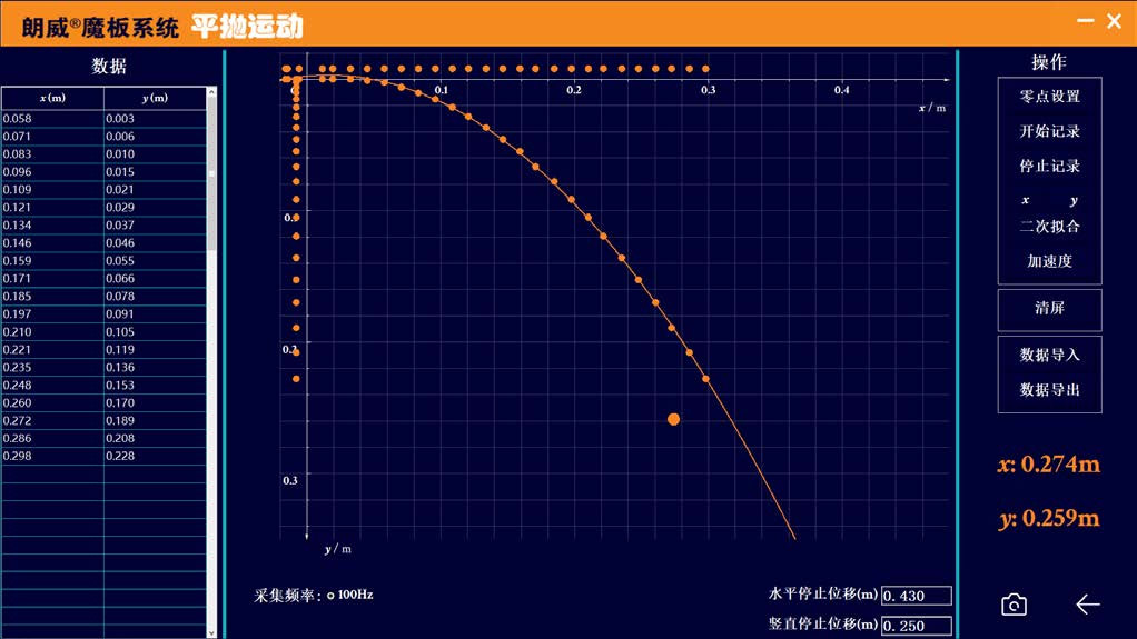 3 打开信号源电源开关,并将信号源置于弹射器卡槽内,单击软件“零点设置”。将信号源压入弹射器内,单击软件“开始记录”,按下弹射器开关,信号源弹出弹射器后做平抛运动并落在接球底槽上。软件自动记录发射器的运行轨迹(图 25 – 4);
