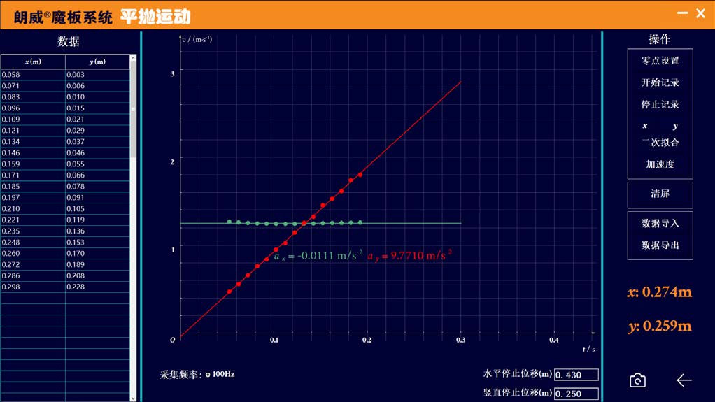 4 单击软件界面“x”、“y”,可将平抛运动轨迹分解为 x 轴和 y 轴上的投影,单击软件 “二次拟合”,可对平抛运动轨迹进行二次拟合;