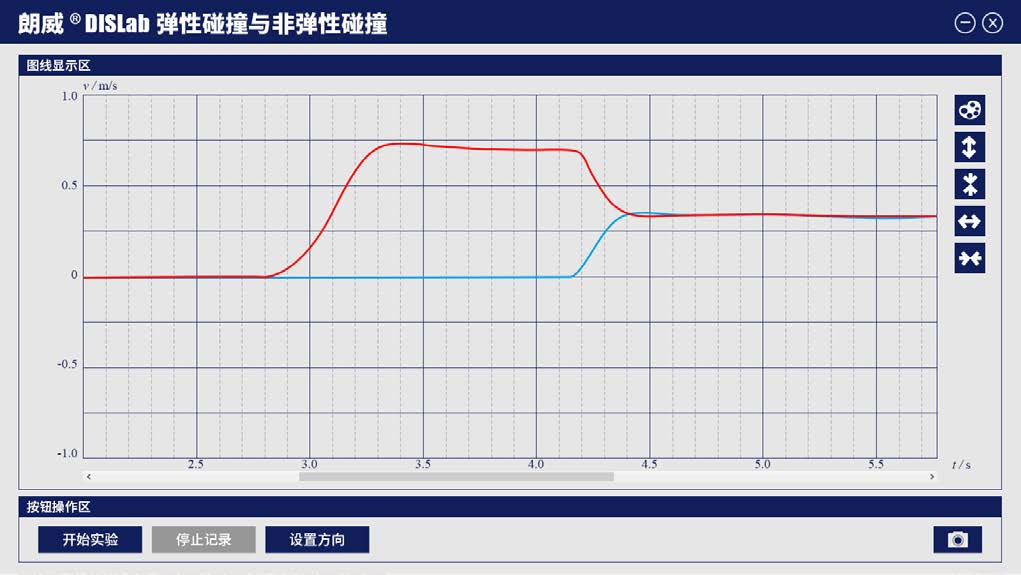 4 将两辆小车(尼龙粘扣面相对)放置到专用轨道两端,重复实验操作得到非弹性碰撞实验界面(如图 31 – 3)。