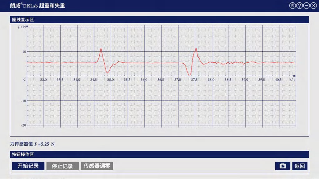 4 利用力传感器、加速度传感器组合实验(图 34 – 2),利用通用软件获得两条图线(图 34 – 4),分析超重、失重与加速度的关系。