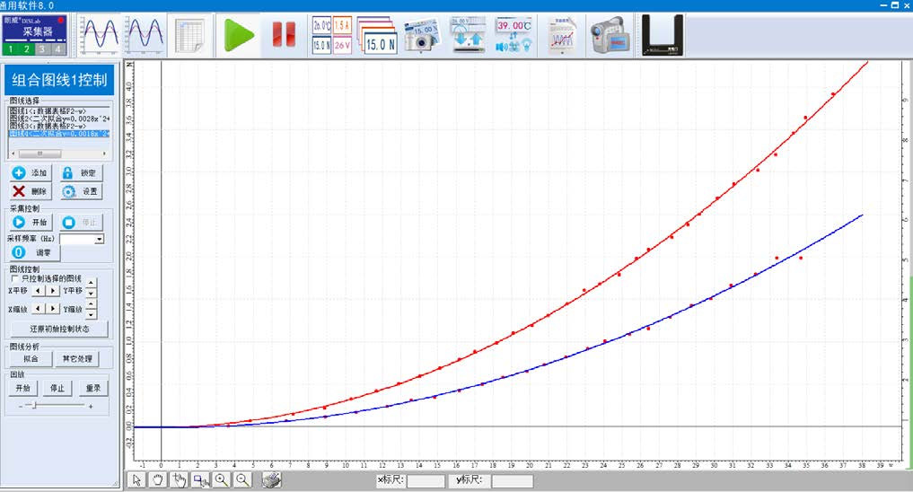 4 依次单击“F – ω 图像”,观察图像数据点基本分布在二次函数图线上,推断 F – ω 呈二次方关系,如图 36 – 3;