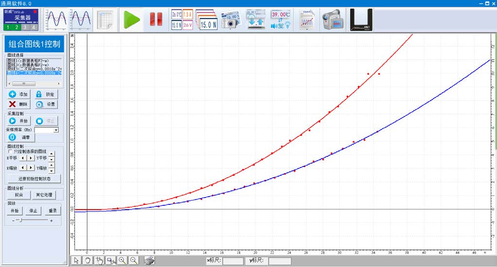 5 单击“绘图”,选取 x 轴为“ω”,y 轴为“F”,得到坐标系内的数据点,对数据点进行二次拟合,如图 36 – 10;