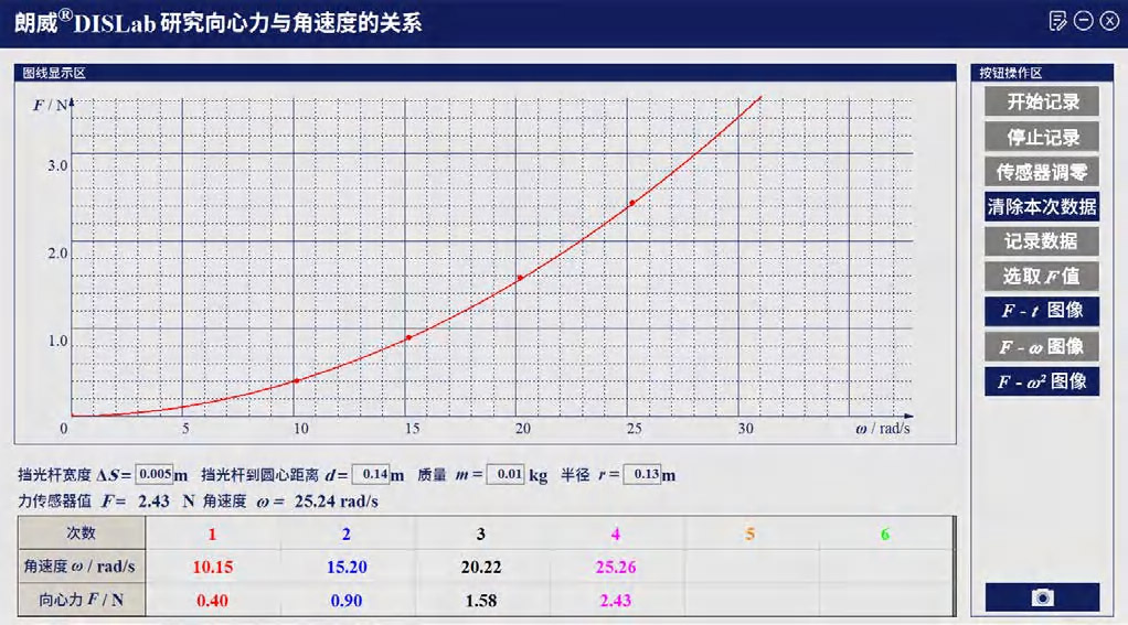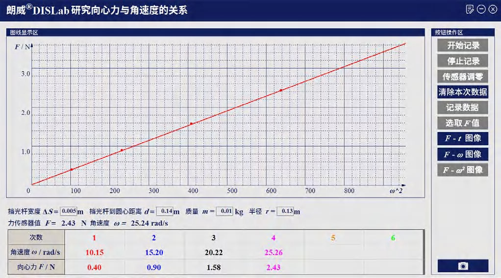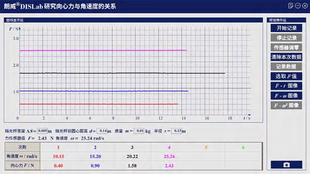 2 单击进入“研究向心力与角速度的关系”实验,输入砝码质量及运动半径,单击“开始记录”,单击“传感器调零”;