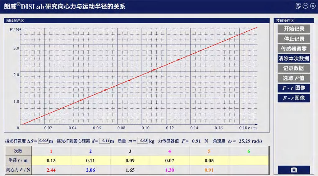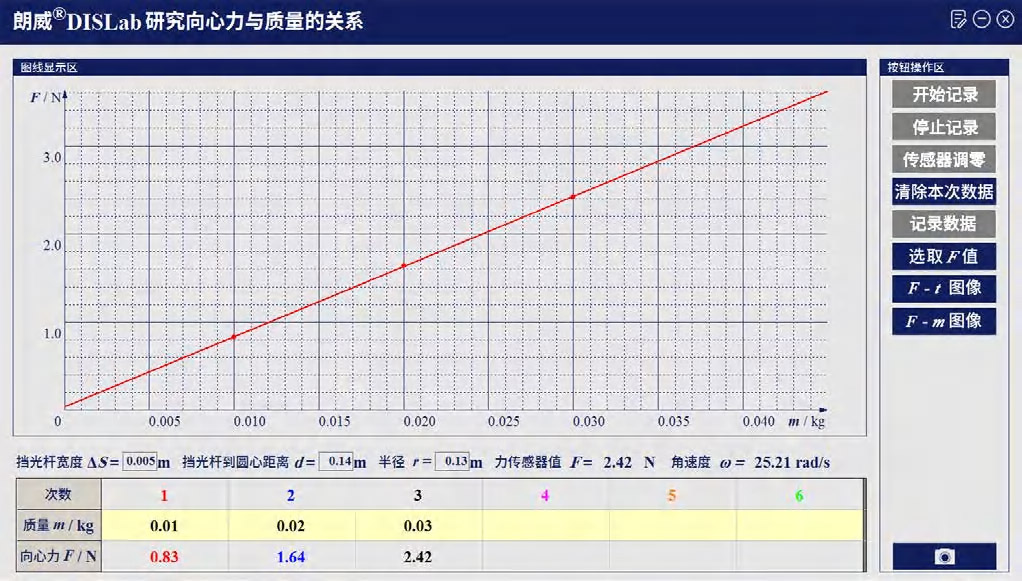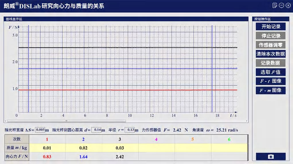 6 单击进入“研究向心力与质量的关系”实验,保证砝码运动的半径及电机控制角速度相同;