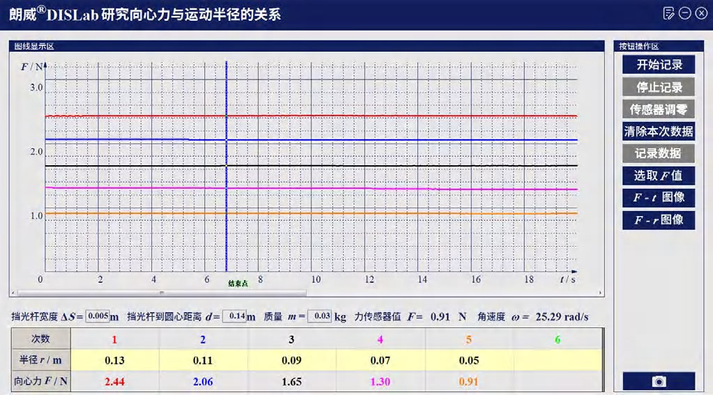 10 单击“开始记录”,单击“传感器调零”;改变运动半径,进行多组实验,记录多组数据,单击“选取 F 值”,得到相同角速度时,不同运动半径对应的向心力的值并记录到表格中,如图 36 – 7;