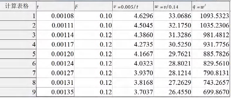 4 单击“公式”,设置计算线速度和角速度的公式:v = 0.005 / t,ω = v / 0.14,得到计算结果(图 36 – 9);