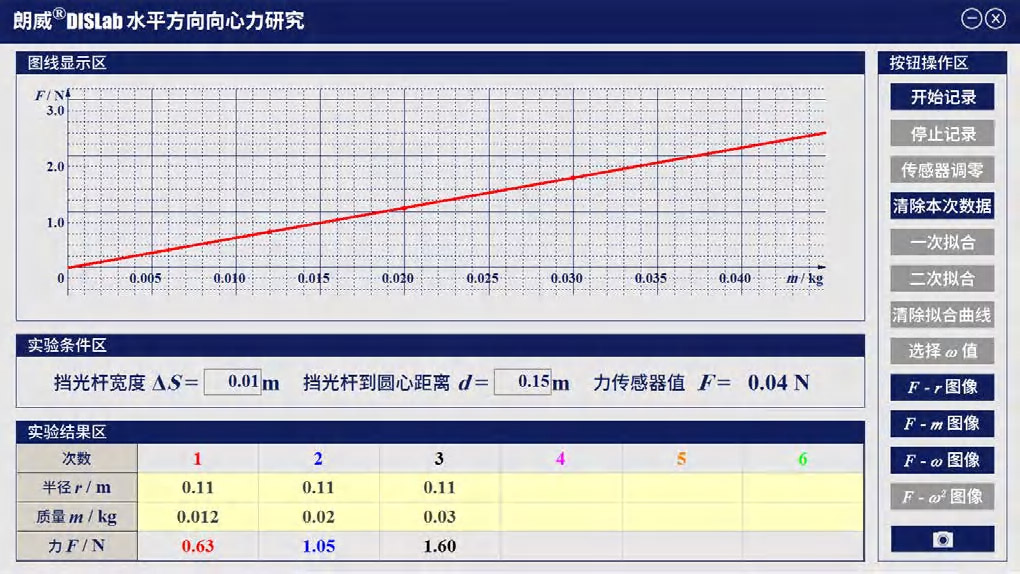 2 将实验器悬臂调成水平,将实验时的砝码质量和运动半径输入表格(本实验中所用砝码质量为 0.012 kg,0.02 kg,0.03 kg);