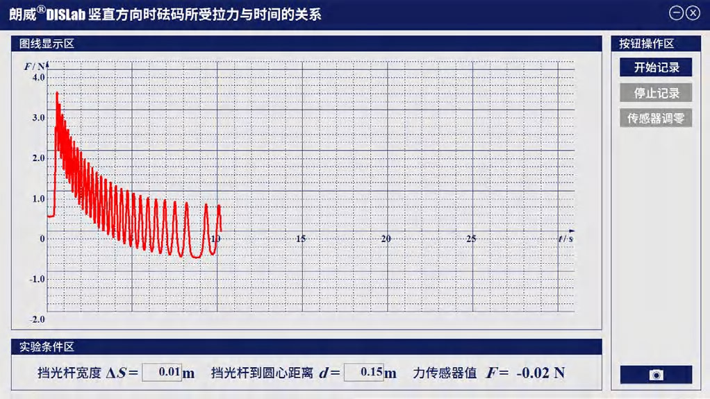 调整悬臂处于竖直状态(图 36 – 18),并在该状态下对传感器“调零”。单击“F – t 图像”,拨动旋臂使之做圆周运动,软件坐标系内将显示 F – t 曲线。通过对曲线分析得知,力的变化是周期性的,随着时间的推移转速减小,周期增大(图 36 – 19)。