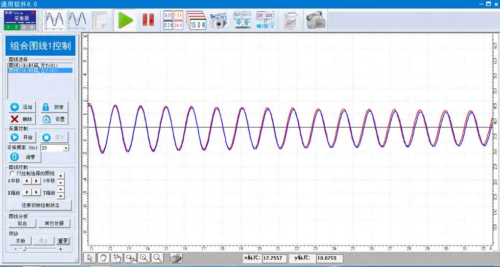 1 打开通用软件,单击“传感器调零”,单击“组合图线”,添加两条“电压 – 时间”图线;