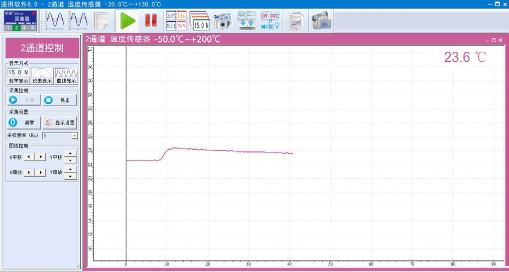 1.打开通用软件,调整为示波显示,用力快速压缩注射器的活塞,可观察到温度升高现象,升温幅度在 2 ~ 4 ℃ 之间(图 41 – 2);