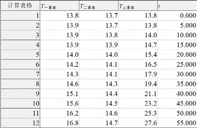 4 点燃酒精灯,加热热传导实验器约两分钟后,“结束”记录,得到多组实验数据(图 43 – 3);