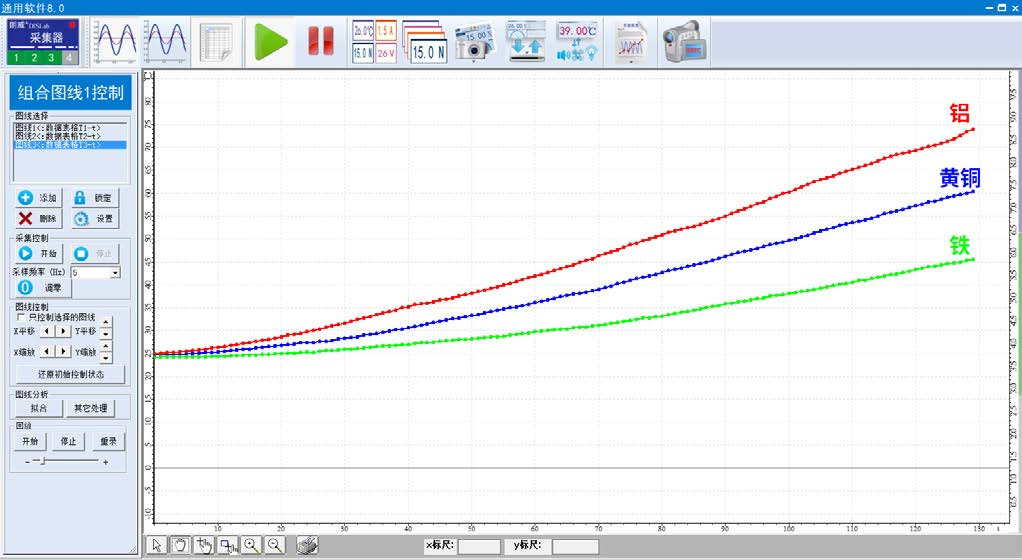 5 将得到有三条自上而下分别是黄铜、铝、铁的温度变化图线(图 43 – 4),可看出三种金属热传导性能有明显差异;