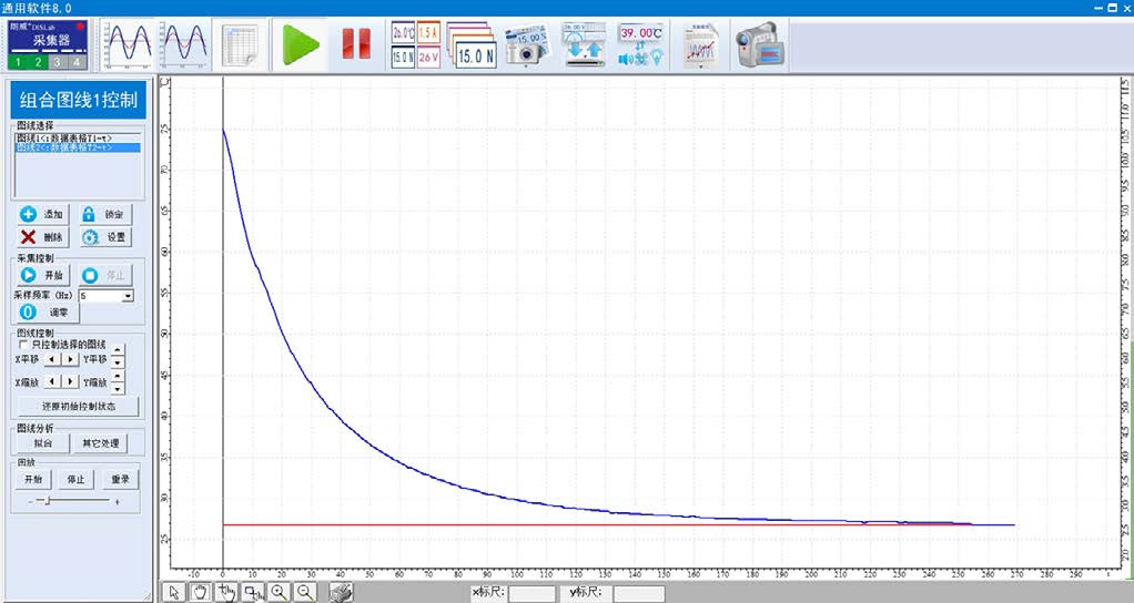 3 单击“绘图”,得到两条温度图线。环境温度图线“T一通道 – t”为红色,水冷却图线“T二通道 – t”为蓝色(图 44 – 3)。