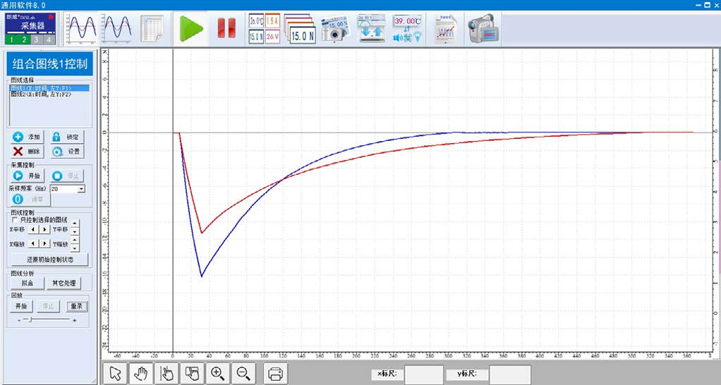 1 将两只力传感器分别接入数据采集器,并将数据采集器接入计算机,打开 8.0 通用软件,单击“组合曲线”,添加两条“F – t”图线,并对传感器进行调零;