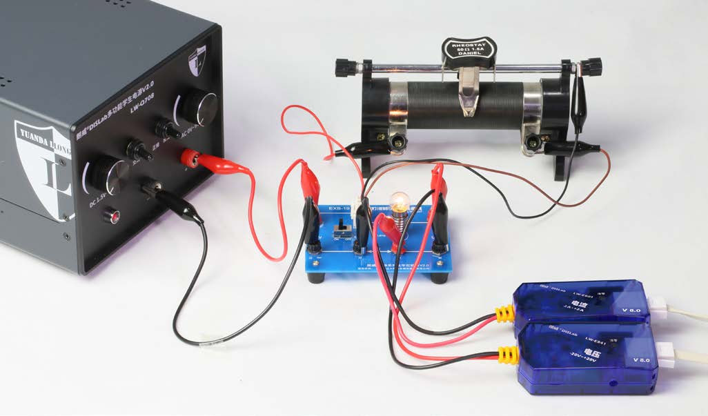 朗威电流传感器(LW-E801)、电压传感器(LW-E841)、电学实验板 EXB-19(LW-6337)、多功能学生电源(LW-Q708)、计算机。