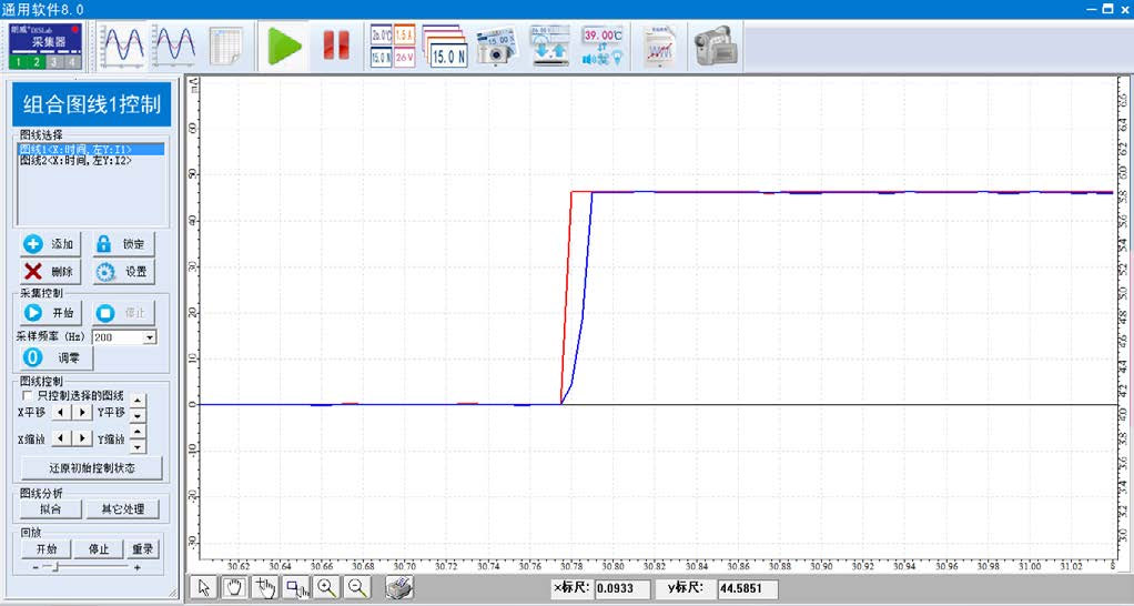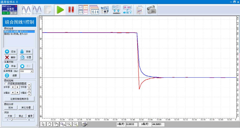 2 打开通用软件,将多量程电流档位调制 200 mA 或者 ±300 mA,对传感器调零,单击“组合图线”,调节采样频率为 200 Hz,增加两条“电流 – 时间”图线;