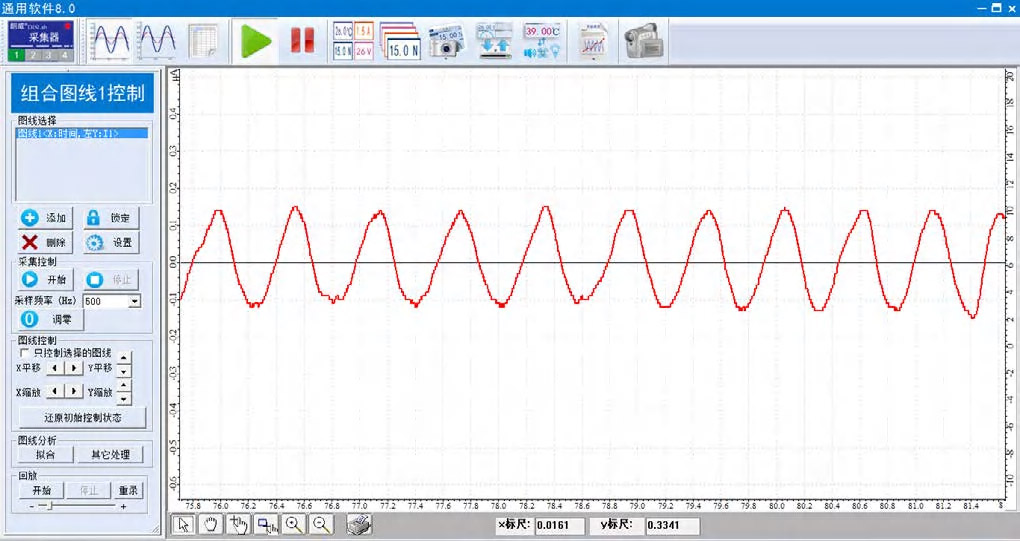 按照实验装置连接好实验器材;打开通用软件,添加一条“电流 – 时间”图线;匀速缓慢摇动地磁场发电机线圈,观察微电流窗口内的图线变化(图 66 – 2)。