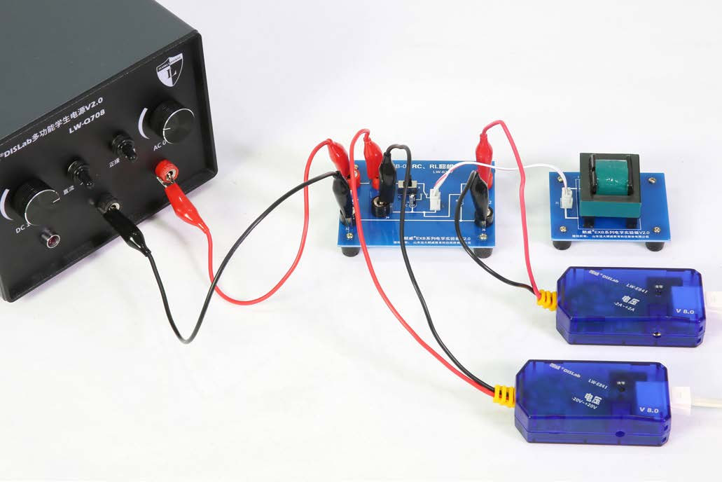 朗威电压传感器(LW-E841)×2、电学实验板 EXB-04(LW-6337)、低压交流电源(或低频信号发生器)、多功能学生电源(LW-Q708)、导线、计算机。